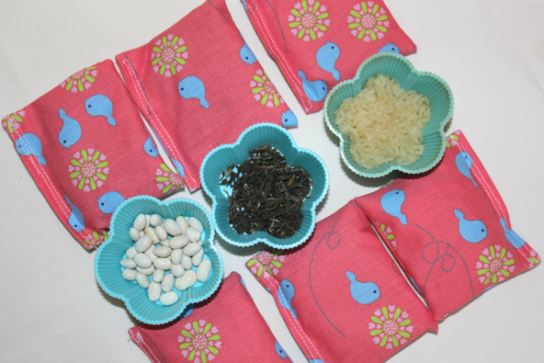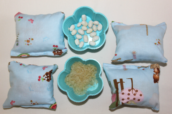 2. Мешочек и 6 подушечек. 3 пары: с фасолью, рисом и зеленым чаем. Задача - найти пары на ощупь. Думать-гадать вместе с ребенком, что же там внутри =)