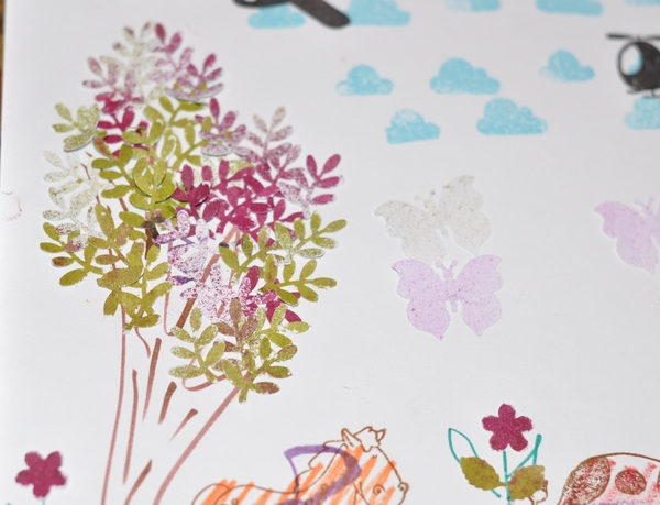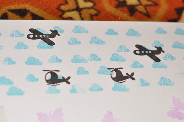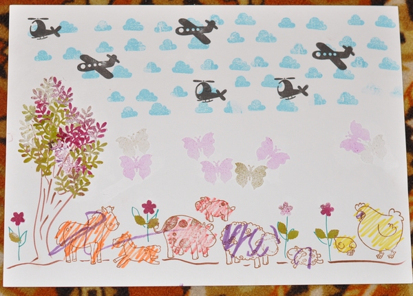 Небо - как же мальчик и без техники, пусть даже на небе. Случайно, в процессе игры, вспомнила, что у меня завалялись детские штампы. Достали подушечки и от души поштамповали ))))