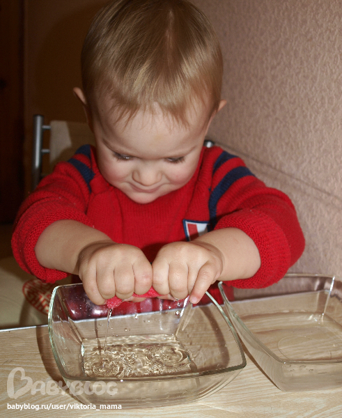 2.Для этого занятия понадобятся: кусочки губки, 2 емкости, одна с водой и чесночница. Необходимо перелить воду из одной емкости в другую, используя чесночницу.Задание прошло на Ура!!