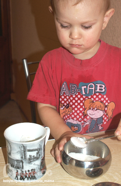 4. Тим готовит папе чай, сам открыл пакетик, насыпал нужное количесво ложек сахара (повторили счет), залил кипятком и размешал.Умница!!!