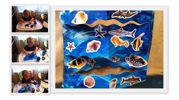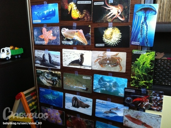 7. Клеили морских животных в готовое пособие «Живой мир планеты. Животные на море и на суше». Вот интересно к некоторым не притронулся вообще. Не стал клеить мурену и рыбу-хирург) чем они ему не понравились. Зато любимицей недели была «акуня» и «осюног».