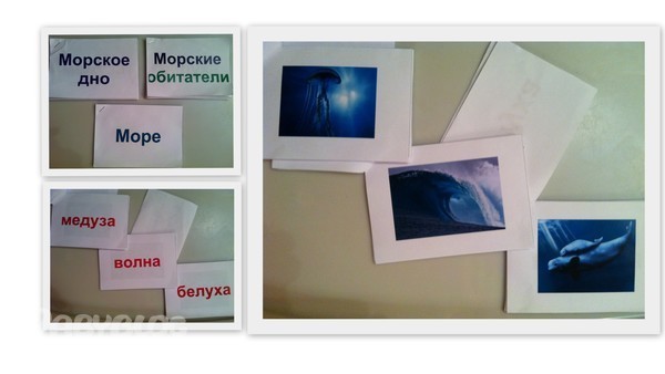 5. Подготовила самодельные материалы по морской тематике на каждый день и готовые материалы из пособий Школьная Мозаика. Наконец-то стало получаться задание «что лишнее»)) вообщем не зря я продолжала показывать и сама рассказывала, что лишнее. Повторяет мой рисунок из наклеек легко. Редко ошибается Материалы здесь .