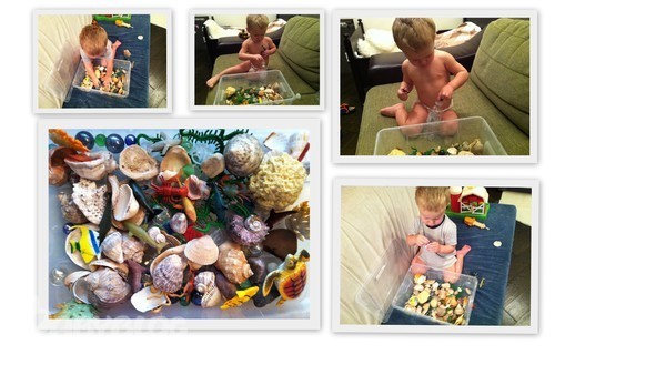 2. Сделала морскую сенсорную коробочку. В нее положила ракушки и камешки с моря, губку, стеклянные шарики, набор морских животных маленьких. Пришлось покупать в двух экземплярах, потому что из первой потерял полюбившуюся акулу. Искали мы ее искали в траве вечером на прогулке с собакой, не нашли. и пришлось идти в ларёк покупать новый набор)