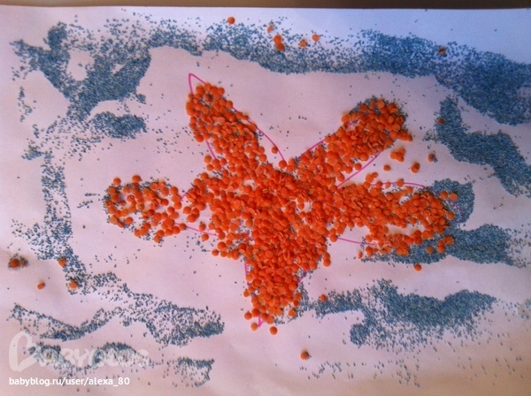 Сделали вот такую звезду из чечевицы и волны из манки покрашенной