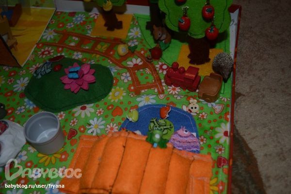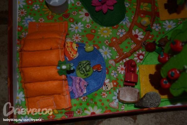 Самодельные игрушкиХотела сначала сшить большой коврик с кучей всяких штучек, но пока решилась на такую маленькую резиденцию: