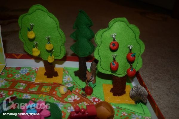 яблочки, груши можно снять и собрать урожай :) и ещё лежат упавшие яблочки из фетра