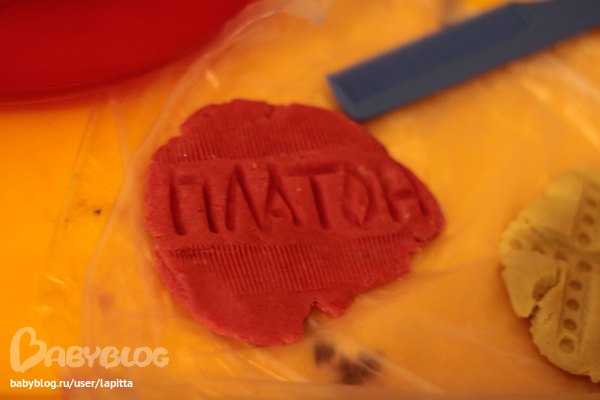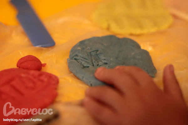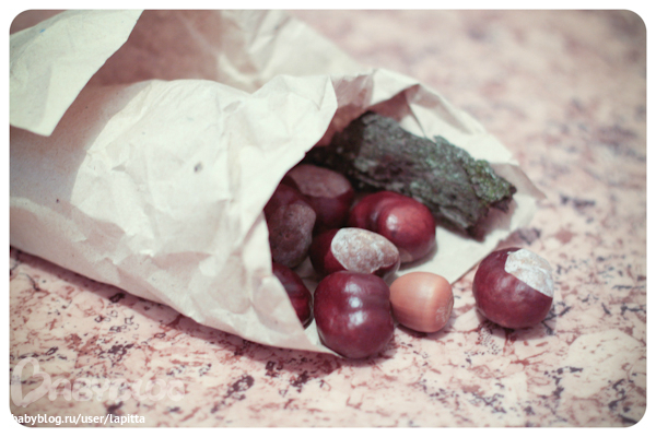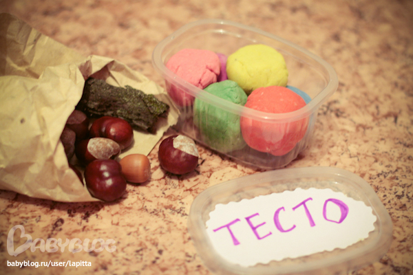 Недавно ходили в гости к подружке и наделали вот такого теста. Красила акварельными красками. И Пакет с каштанами прихватили:)