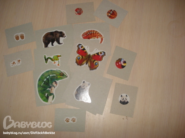 На отдельные картонки наклеили эти наклейки и получилась игра где надо по фото, следу, окраске и т.д. подобрать нужного зверька