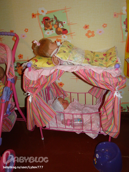 Так как пусов уже 3,а кровать одна Настя придумала из балдахина сделать второй этаж!) Постелила комплект белья и Карина заметельноспит на втором этаже.