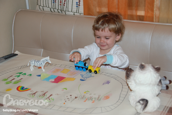 а мы купили магнитно-маркерную доску, планировала повесить на стену, но дети не дали... каждый раз придумываем новые сюжеты... катаем машинки, паравозики и т.п. и таскают ее из комнаты в комнату