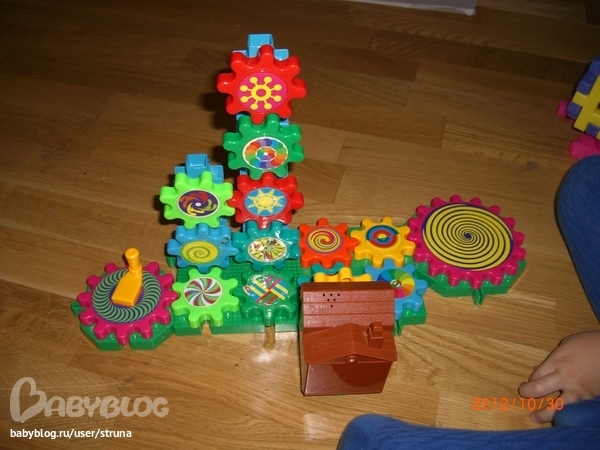 Раньше нас в этом конструкторе интересовал только музыкальный домик с ужасно надоедливой мелодией. Ей мы мучили маму. А теперь нас Мишу реально заинтересовали шестеренки. Миша останавливал одну из них, смотрел на другие, вставлял, чтобы они крутились. Пока хочу дать ему наиграться, а потом можно будет делать маленькие задания - типа соединить 2 шестеренки на расстоянии друг от друга, подобрать по размеру. В общем. очень интересно получается.