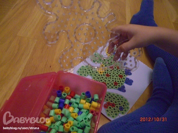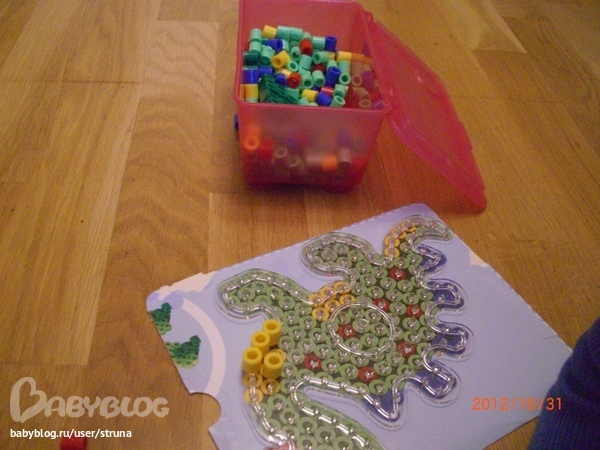 Развивающие игрушки (пазлы, вкладыши, конструкторы, мозаики)Вставляем детальки по картинке. Я довольно часто предлагала Мише мозаику, но только сейчас он стал пытаться подобрать цвета.