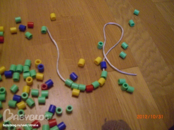 Нанизываем на ниточку. Ниточку держу пока сама, а он одной ручкой нанизывает. Нравится, нанизывает ловко, так что попробую дать ему ниточку в руку.