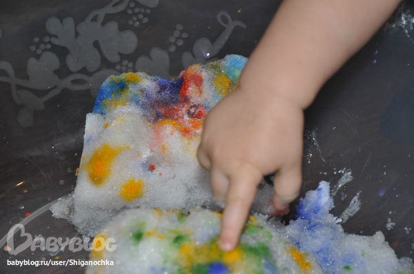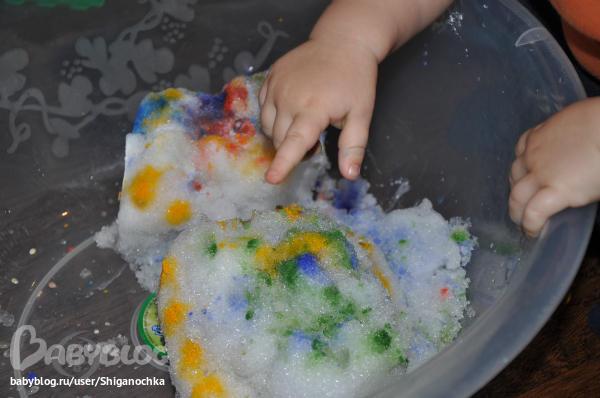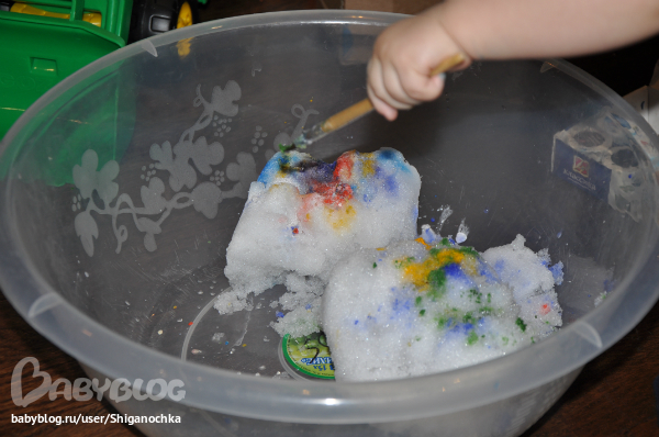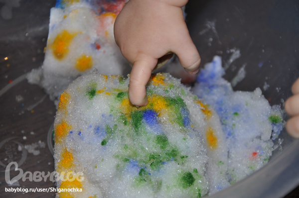 Игры и игрушки для малышей от 1 года до 2х летИ мы тоже попробывали рисовать на снегу! правда было это неделю назад, а сейчас снова нет снега. И вообще снег выпал только на один день. Но зато сколько эмоций было за этот день! Мы пошли гулять и взяли снег с собой домой, и дома уже играли. Смотрели как распределяется краска по снегу, как он тает в ладошках, а потом высыпали в ванну и смотрели какие разноцветные ручейки бегут от снежных комков, если на него полить из душа. В общем было весело!