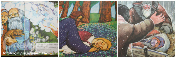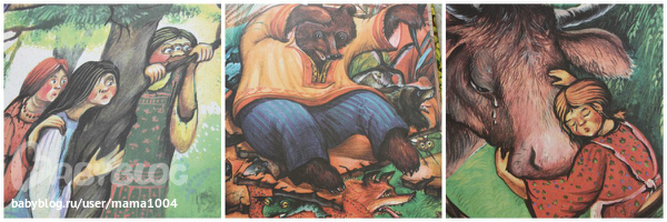 Я конечно всегда знала, что русские народные сказки-это особые сказки, не знаю уж чем они хороши, и чему они учат, но почти везде-дух смерти!!! это нормально? поэтому я всегда концовочку на свой лад переделывала, чтобы не травмировать детскую психику, а то и вобще не читала... Вот несколько иллюстраций. Снегурочка. Смерть...все плачут, дальше опять девушка умерла, а третья картинка коллажа-вобще не для слабонервных-наша Морозко((( фиалетовое лицо- УЖОС и кашмарррр!!! Ниже ещё всякие страсти-мордасти...первая картинка-Крошечка-ховрошечка все уродины, одна одноглазая, другая трёхглазая...Вторая картинка-медведь ДАВИТ животных в кувшине, ...ещё только кишки не нарисовали... и последняя-корову хотят зарезать, и она говорит девочке, типа не ешь моего мяса, закопай мои косточки.... Ну короче иллюстрации-кошмар, да и текст какой-то мрачный.... А вы читаете детям РУССКИЕ НАРОДНЫЕ СКАЗКИ ( я-исключительно выборочно, со спокойным, но поучительным сюжетом, а не про смерть..)