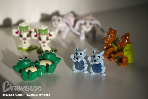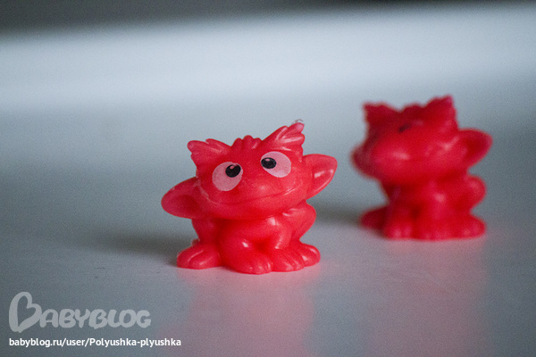 Федюня пока из всей кучи выбирает только двух таких чудиков. Может быть, из-за яркого цвета. Остальными фигурками играет просто так, перекладывает с коробки в миску, разбрасывает вокруг, и т.д.