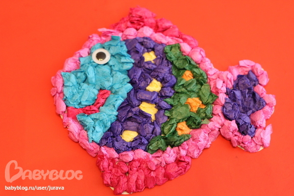 Самое интересное, что Соня практически все делала сама. Очень простые, но эффектные техники. Особенно рыбка. Надо закупиться тонкой бумаги, и ребенок занят на час :)))