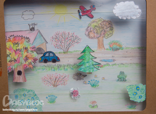 Я не совсем поняла вопрос. По ссылке посмотрите - в блоге есть фото отдельно крышки и отдельно нижнего слоя с пейзажем. Объем от того, что картинки приклеены лицом к крышке прозрачной, а машинка по пейзажу едет:-)