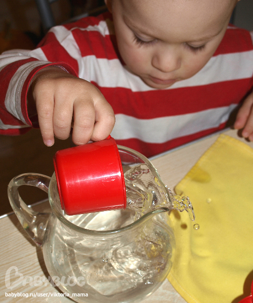 1. Наливаем воду из кувшина в стаканчика, ровно до верха, не разливая воды.