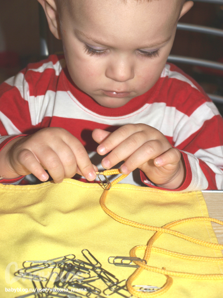 2.Нанизываем скрепки на шнурок.Причем не успела я озвучить смысл задания, как Тим схватил скрепку и начал нанизывать на шнурочек.