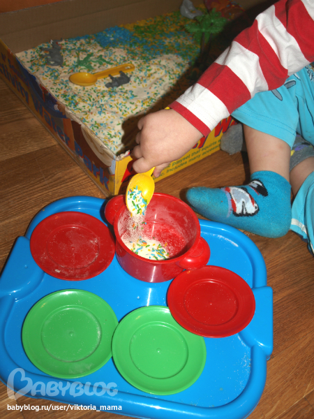 6.Ролевая игра. Насыпаем ложкой в кострюлю крупы и готовим кашу, помешивая.