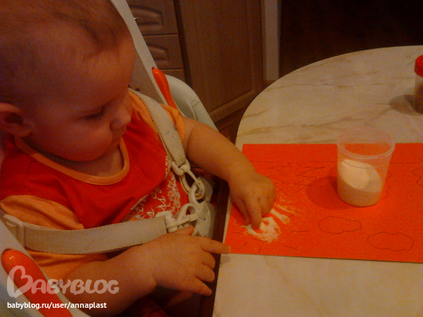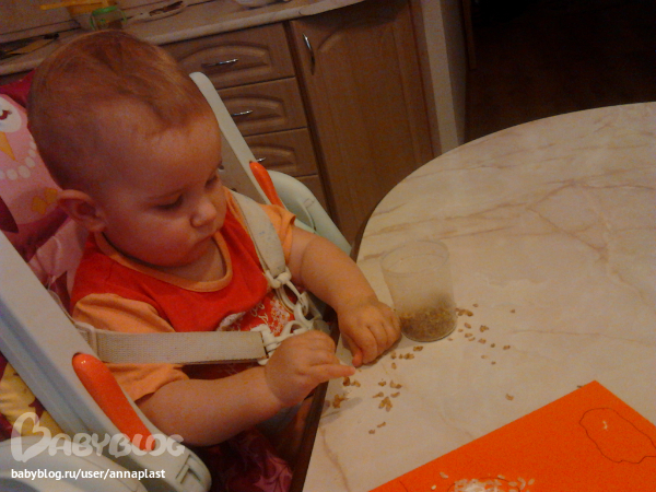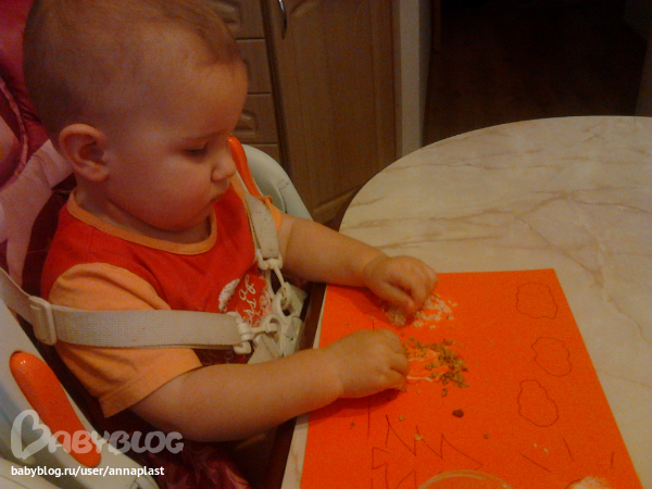 Творческим заданием стала аппликация из того, чем мы шумели. Я нарисовала картинку, Маша посыпала ее крупами. А потом Маша просто сыпала крупу на стол и перебирала ее пальчиками. Делала это очень внимательно, сосредоточено. Мне это очень понравилось.