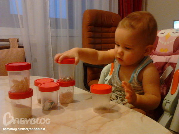 Сначала что-то типа презентации: глазки видят, ушки слышат, ручки трогают, язычок проверяет на вкус, носит нюхает. А потом перешли на слух. Все началось с баночек Монтесссори. У нас уже были три баночки, но мы их мало слушали, чаще Маша просила высыпать содержимое, чтобы поиграть. А сейчас баночек стало 9 штук (манка, рис, гречка, макароны, шарики из фольги, порваная бумажка, монеты, счетные палочки и пустая баночка), и Маша с удовольствием слушает их каждый раз, когда проходит мимо. А вчера в гости приходили ребятки постарше, они распределяли баночки по уровню шума.
