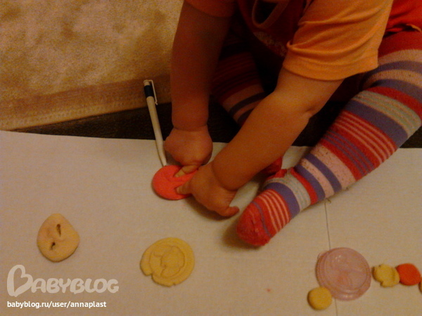 Вечером лепили из цветного соленого теста. Маша кормила курочек и делала дырки в пуговицах:)