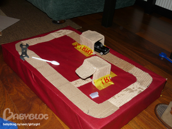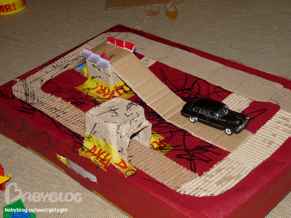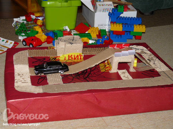 красивая трасса, все аккуратненько и малыши увлеченно играют....ага... нас все начиналось тоже хорошо...обклеили оберточной бумагой коробку из-под детских весов (так, чтобы её можно было еще исп-ть как чемодан для конструктора:)