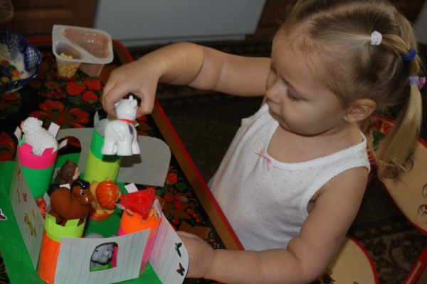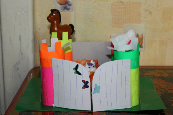 Больше всяких игрушек Катька любит домики (ни одна коробка у нас не пропадает, в каждой вырезаем дверь и окна ))) Но коробки поднадоели, а вот замок пошел на "ура".