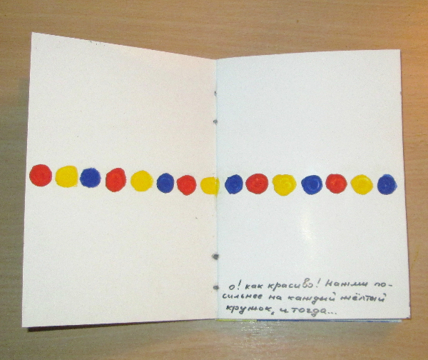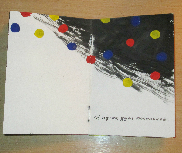 Самодельные игрушкиВстречала пару раз в инете вот такие самодельные "Живые книги" и тоже загорелась ее сделать. Делала из двухстороннего белого картона. Листы сложила пополам и сшила между собой попарно. Понадобилось 14 листов картона, т.е. в книжке получилось всего 28 листов. Рисовала гуашью, но пару страниц дорисовала акрилом, т.к. гуашь закончилась. Ребенку книга вроде понравилась: нажимал, дул, смеялся, но бурного восторга все же не было. "Прочитали" ее два раза подряд и пока отложили.