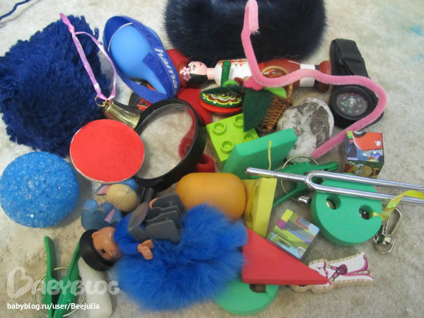 Вообще можно просто класть предметы в мешок и доставать, но мне больше нравиться когда сами предметы, по какой-то одной теме лежат как бы в основе, получается, что пальчики перебирают в большом количестве вещей ищя то что нужно, дополнительный массаж, дополнительная стимуляция. Ну вот например в последний раз для кубиков в качестве наполнителя я взяла , получилось очень необычно. А кубики использовала от