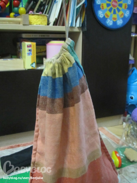 а вот такой большой мешок я использую для деревянных кубиков, треугольников, прямоугольников... на ощупь определяем форму предметов геометрических