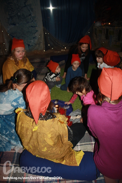 ПОиграли пальчиками в маленьких гномиков, нам раздали колпачки с бубенчиками, мы их одевали на пальчики и ходили друг другу в гости: "Тук-тук-тук, гномик дома?!" Диме тоже понравилось, как тетя Маша к нему стучалась ))