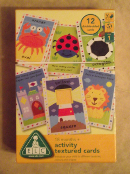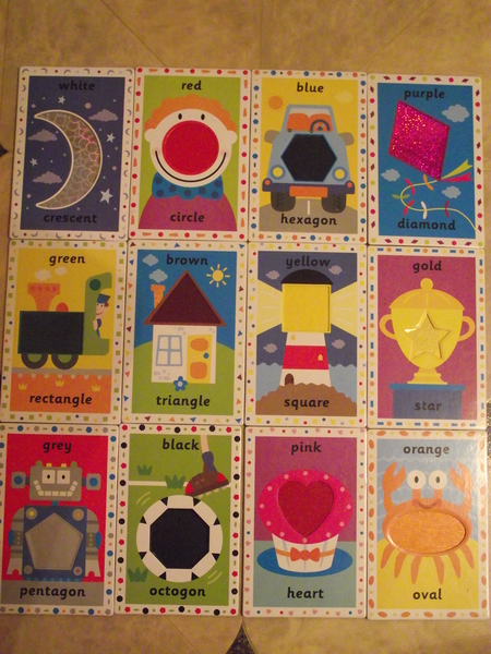12 карточек, на каждой предмет описан двумя словами на ангийском (цвет и форма), на каждой есть фрагмент, который можно потрогать (бархат, атлас, глянцевая бумага и т.д.)