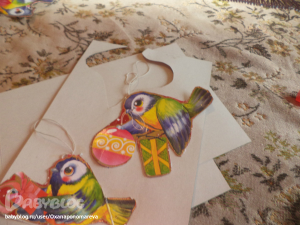 Вот такие замечательные снегири и синички ждут своего места на елке. Сделала очень просто. Вырезала из корбки от конфет (подарок на прошлый НГ) и приклеила на картон. Между двумя картонками вставила петельку из нитки. Ребенок помагал клеить.