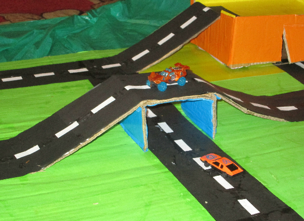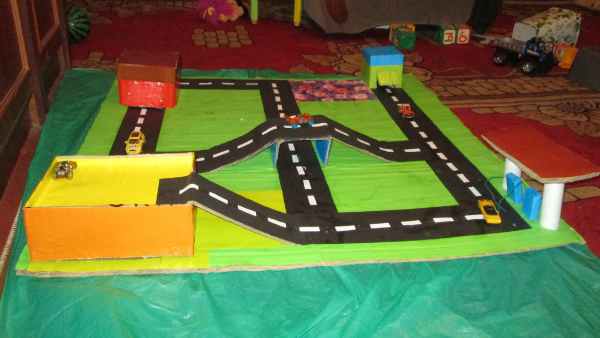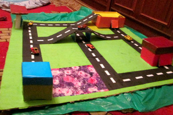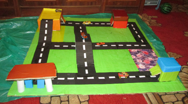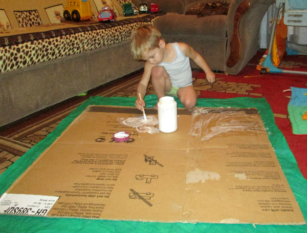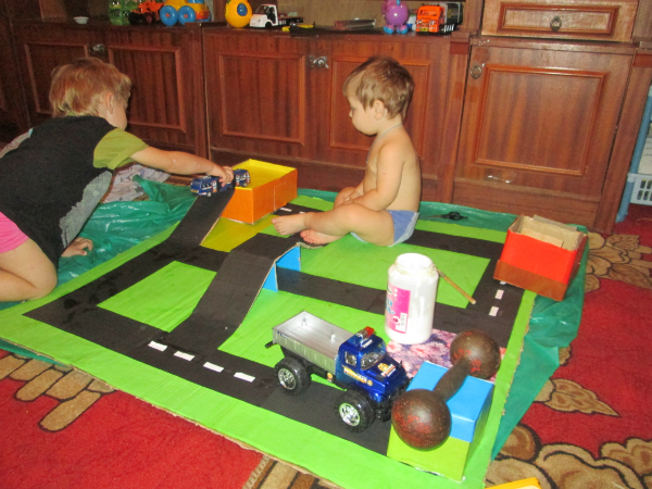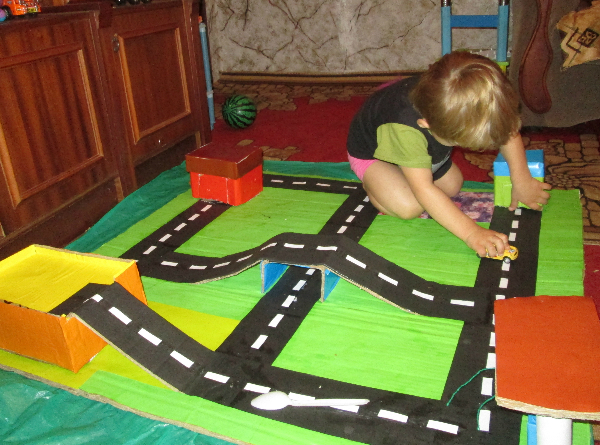только бумагой, до этого я гуашью дороги рисовала, так пачкаются руки-коленки сильно.