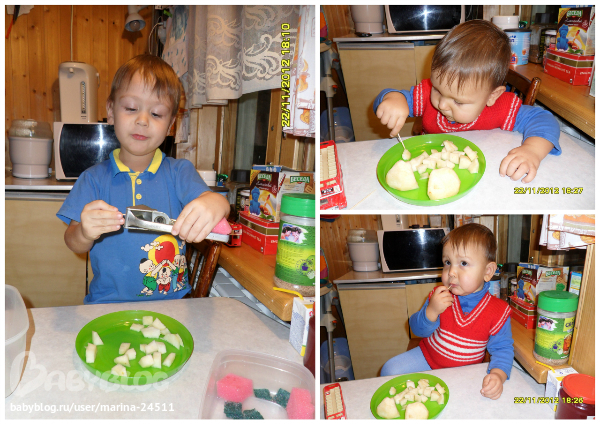 Зубочистки+ груша= детки счастливы) У Миши очень хорошо получается нанизывать грушу на зубочистку) а Дима решил вышать сок из груши, а потом читил пресс зубочисткой)