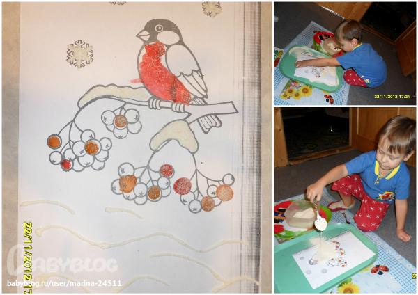 Понадобилось: Картинка, пластилин (оранжевый и красный), клей ПВА, манка, и ложечка с дырочками)