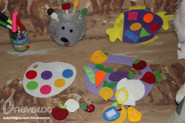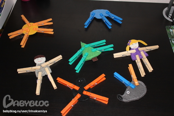 еще давненько мы сшили игрушечки, на которые нацепляем прищепки, очень любим их с удовольствием играем. Они очень быстро делаются)некоторые я не шила, а просто клеем приклеивала, для моторики очень полезны игры с прищепками.