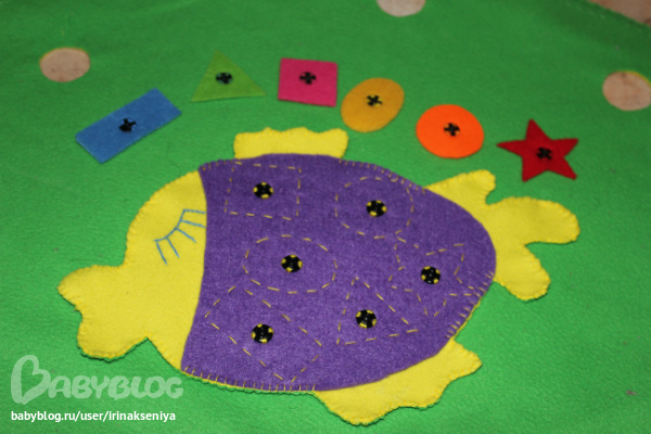 А для изучения геометрических фигур и цветов, появилась у нас такая рыбка с основными фигурками. Крепятся фигуры на кнопочки. На теле у рыбки пунктиром намечено куда какую детальку крепить