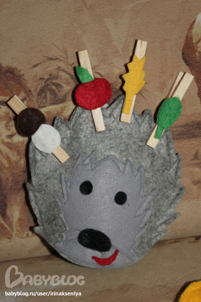 А это наш любимый ежик с прищепками, игрушка-рукавичка, тоже идея взята у http://shillopop.com/2012/09/09/ezik-c-prishepkami/