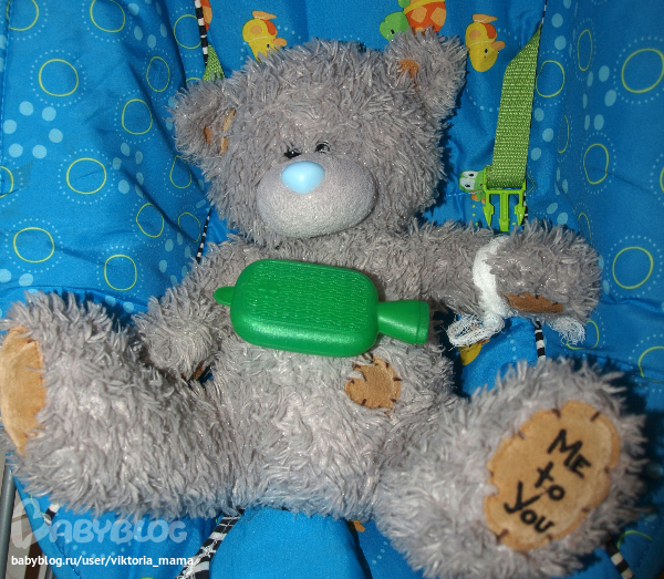 Кладет грелку на животик