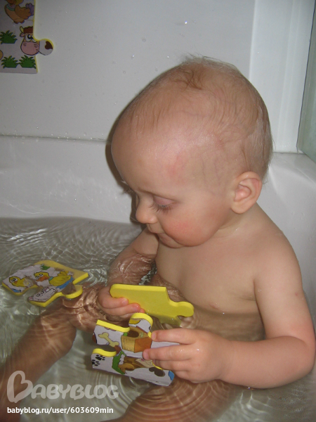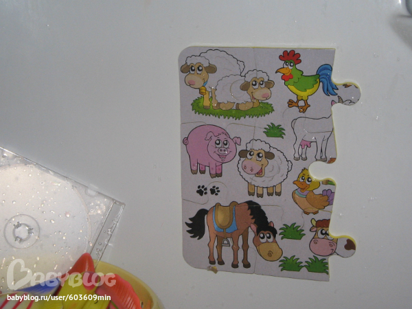 Пробывали собирать пазл с домашними животными, решили поиграть в ванной.