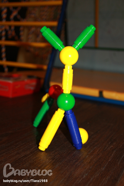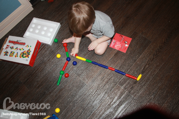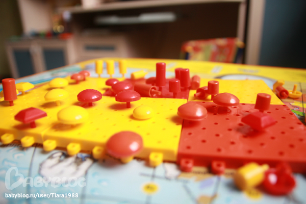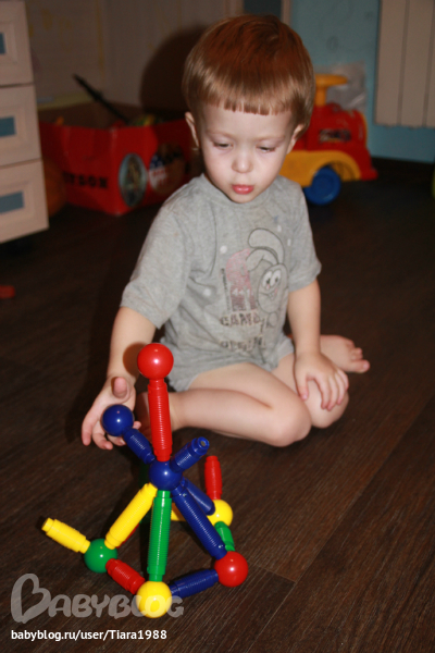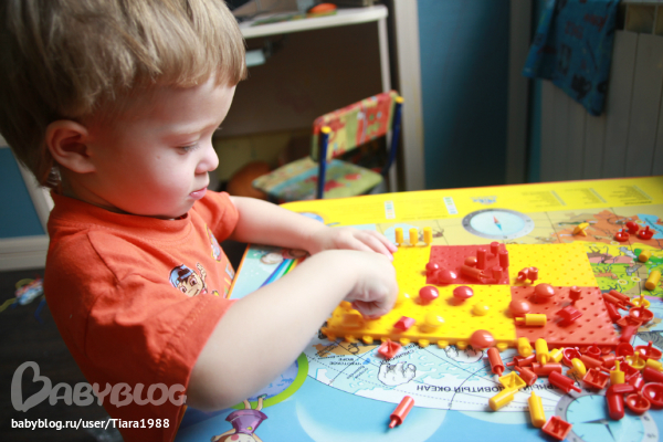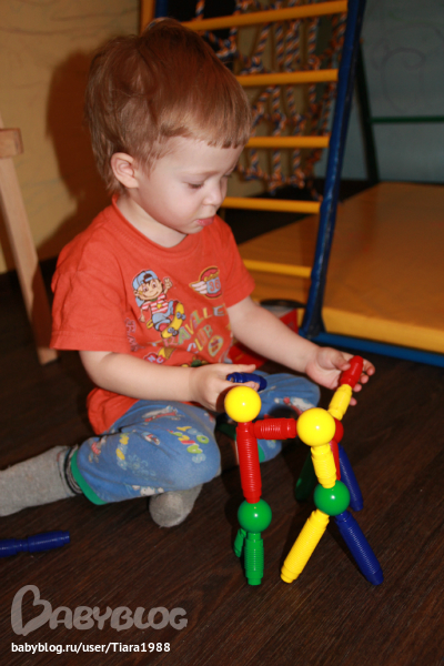 Данька пока просто знакомился с такой мозаике и мы ее собирали без всяких правил..шляпки он к шляпкам тыкал.. столбики к столбикам.. вот такая логика)