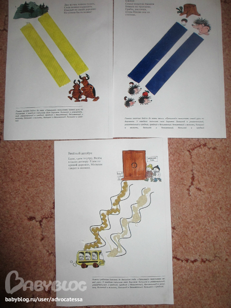 Слева-направо: желтые дорожки колючая и мягкая липучка, в синих-наоборот, макароны и манка