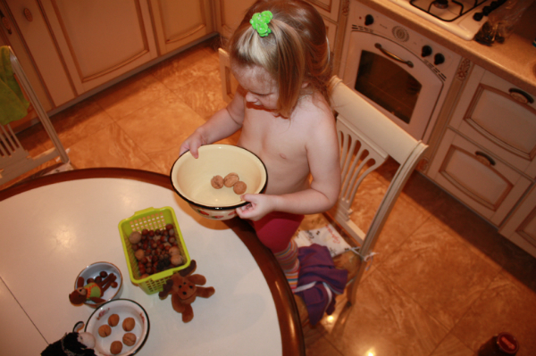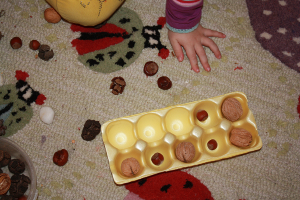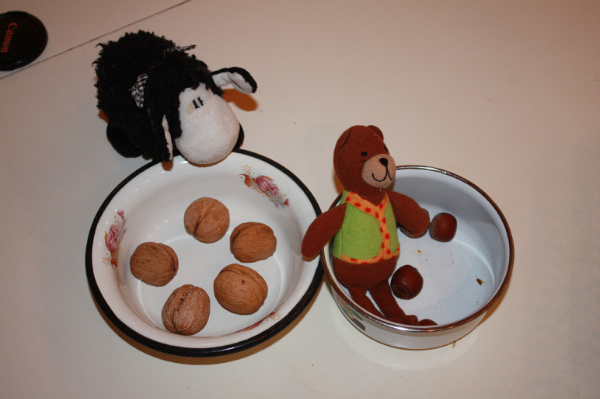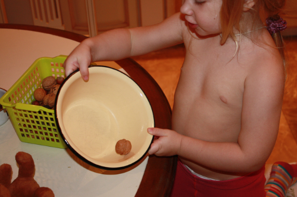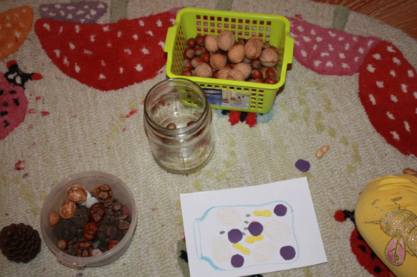 Заполняем банку по образцу, кружками помечаем каждый положенный орех, потом считаем кружочки и делаем вывод, сколько лесных орехов (например) у нас на картинке.