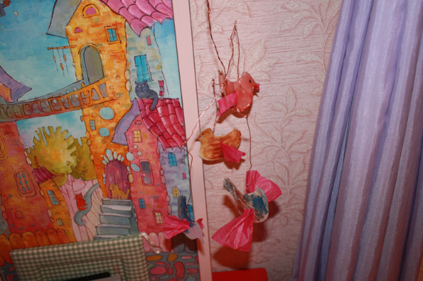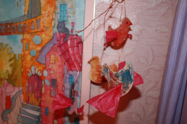 Мы пытались это выяснить, рассматривая плакаты и сравнивая ее с этими птицами. Вроде решили, что перелетная. Но лететь на юг птичка не может одна, ей нужна стая. Вот мы всю стаю покрасили, сделали крылья, а потом, чтобы они не растерялись, скрепили проволочным каркасом (по типу конструкции мобиля детского с ручкой). Алиса бегала со стайкой птичек, они напроволке пружинят, будто летаеют:)