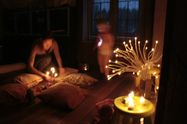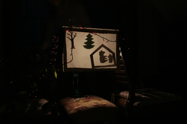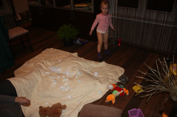 Потом мы погасили все фонарики, и "легли спать". А пока мы спали, поляну засыпал снег (папу тоже засыпал). Наступила зима! Звери проснулись, поиграли в снежки и вручили Алисе подарок - книгу про лес, календарь ожидания зимних праздников и сладости. Ура! Алиса побежала показывать подарок бабушке и делиться впечатлениями