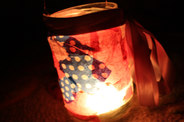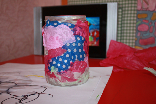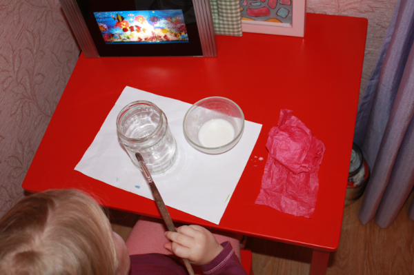 Мы начали делать фонарик. Обмазали банку клеем пва, разведенным с водой и приклеели кусочки полупрозрачной бумаги, сверху тоже промазывали клеем.